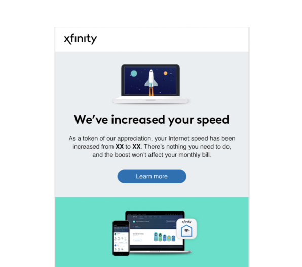 To amplify the good news, we co-promoted faster speeds with another free benefit: the free xFi app. Collaborating with the Engagement team, we wanted to create excitement around faster and more secure Internet. I created emails and coordinated in-app messages, push notifications, and text messages promoting faster speeds + the xFi app, all at no added cost.