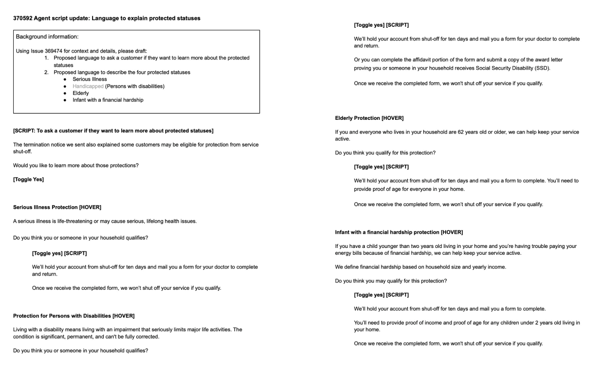 PPL had updated its policy on protections for customers in protected classes. These protected classes were expanded to include a wider range of ages, different income levels, and more. This script walks agents through how customers can determine if they’re able apply for financial assistance under these criteria. The word [HOVER] indicates where agents can hover their cursor over different categories of protected classes so they can explain the requirements to customers in their billing software. We’re guiding the agents on how to guide the customers through the application process, and how to document the interaction.
